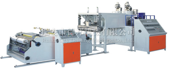 DF-65×2 型全自動雙層共擠流延膜機,是根據(jù)國內(nèi)外同類產(chǎn)品的特點不斷改進的一種機型。該機采用兩條螺桿擠出,運行穩(wěn)定、噪音小,采用人機界面控制,收卷采用微電腦可編程(PLC)控制器。它由擠出機組、牽引、升降、調(diào)平、修邊、成品雙工位自動換卷、電器等主要部件組成。